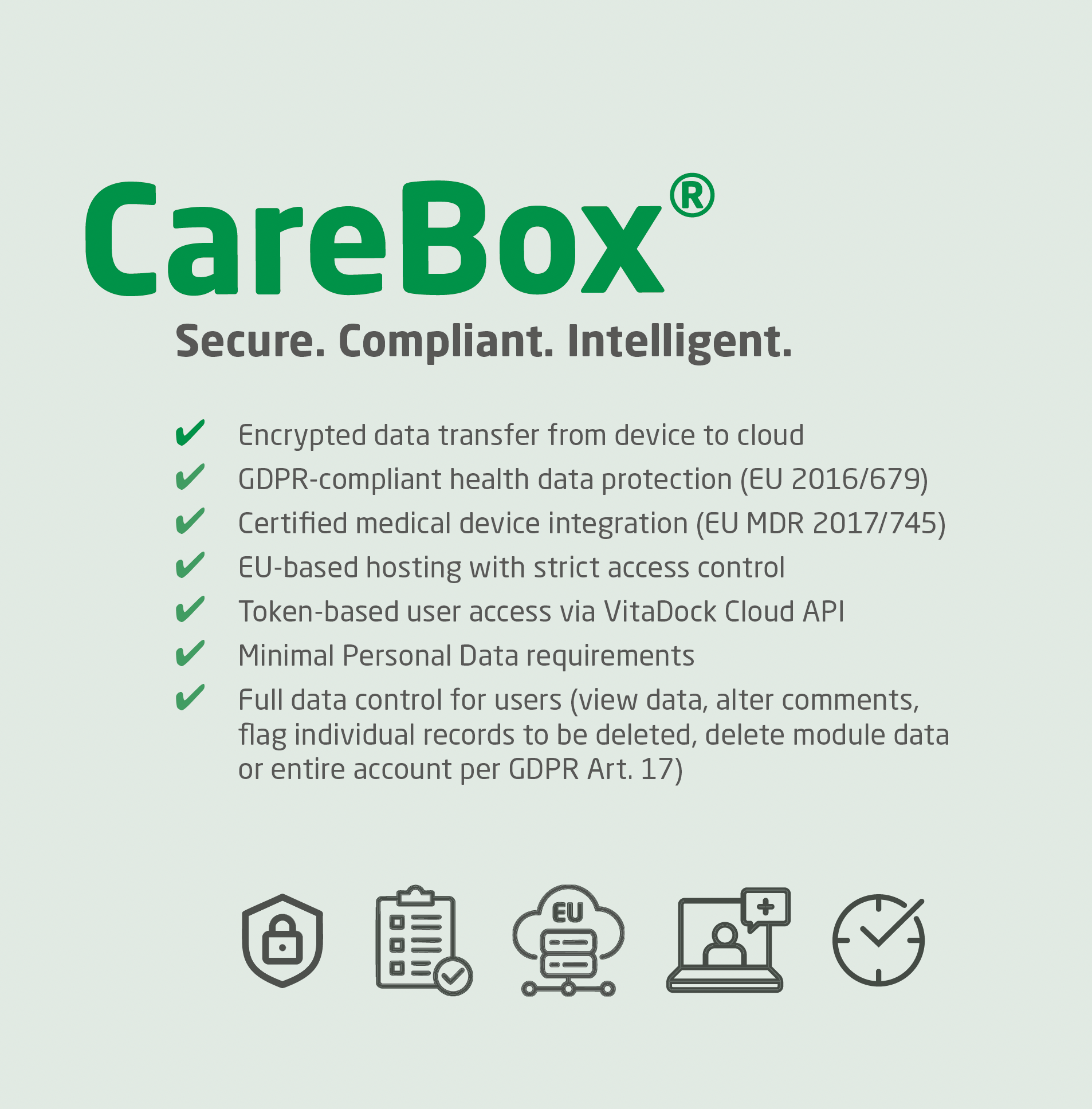 CareBox® is a scalable digital health platform that connects medisana measuring devices, caregivers and healthcare professionals via one central HUB. Vital data is captured at home or in care facilities and securely transferred to the VitaDock Cloud, where professionals can monitor, assess and act in real time. Less paperwork, more time for patients.