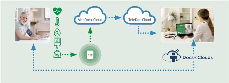 The HUB automatically collects data from all connected devices and securely transmits it to the VitaDock Cloud – fully automatically and without any user interaction required.